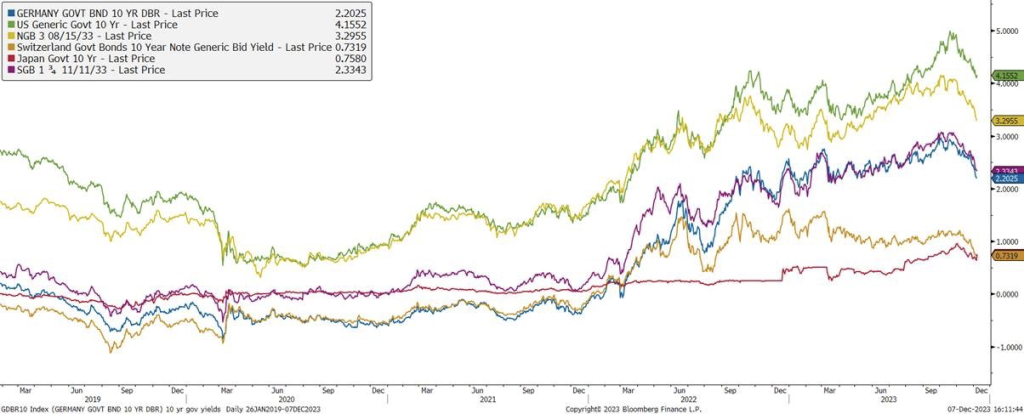 November cementerade förväntningarna att världens centralbanker har nått toppen av räntenivån i denna cykel. FED, ECB, BoE, Norges Bank och Sveriges Riksbank höll alla styrräntorna oförändrade och marknaden prissätter endast en marginell sannolikhet för ytterligare höjningar. Fokus har nu flyttats till när centralbankerna ska göra de första säkningarna, och hur mycket de kommer att sänka när de väl kommit igång.