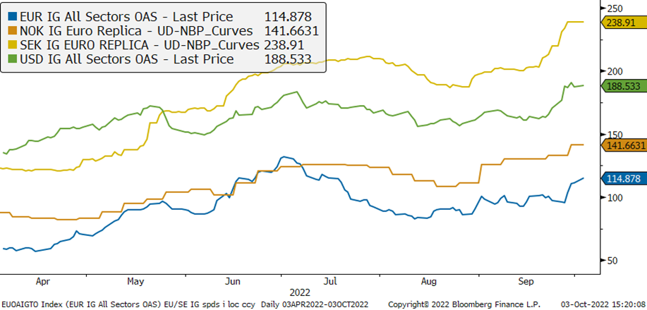Kreditmarknaderna präglades av låg likviditet och negativt sentiment i september. Kreditspreadarna har ökat på alla våra marknader. Vi har upplevt bättre likviditet på EUR-marknaden än på de nordiska marknaderna. Kreditspreadarna har också hållit sig något bättre i Norden.